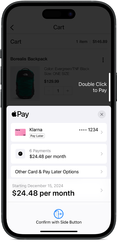 Apple Pay gives you flexibility at checkout when you shop online and in apps with iPhone or iPad. You can choose to pay in full or split your purchases into smaller payments over time through an eligible card or other pay later provider.2