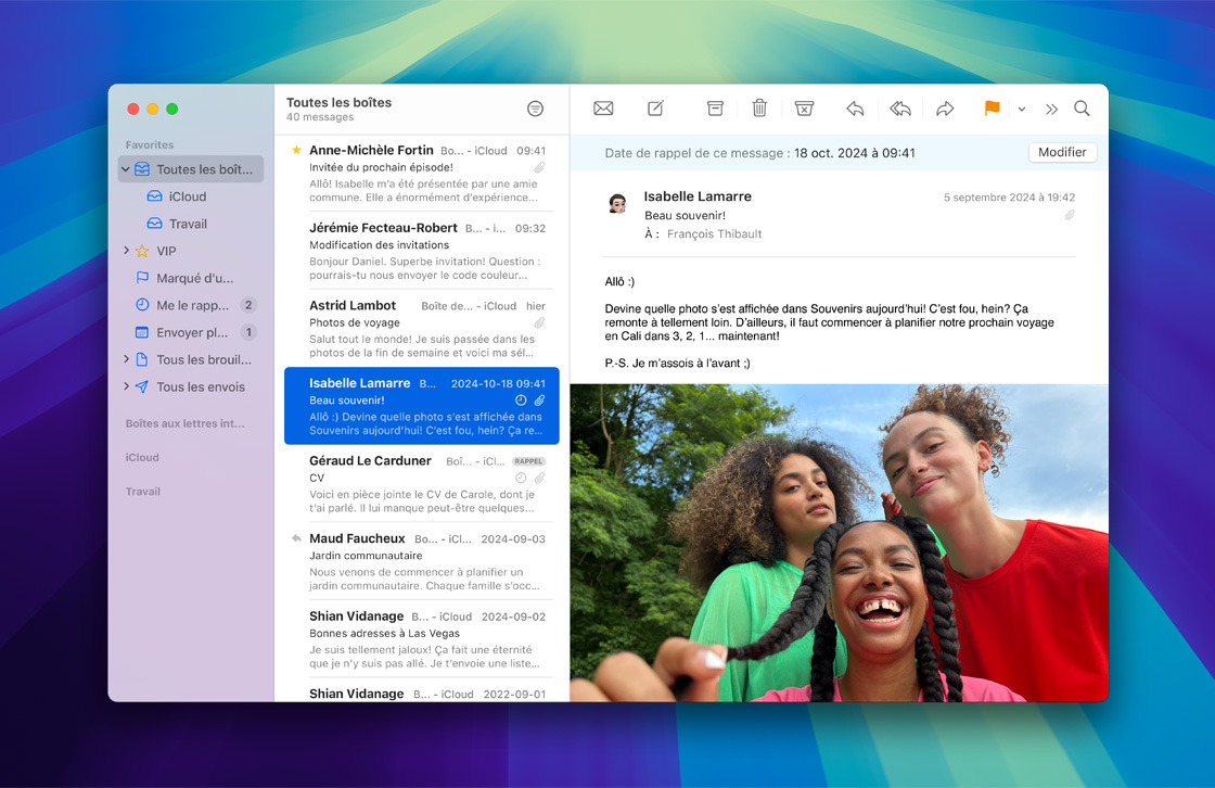 Mail iCloud est intégré à l’app Mail sur vos iPhone, iPad et Mac. iCloud.com permet d’envoyer et recevoir des courriels de n’importe où. Et les protections antipourriel et antihameçonnage de Mail interceptent les messages indésirables avant même qu’ils n’atterrissent dans votre boîte de réception. Configurez votre adresse @icloud.com facilement, et personnalisez votre nom de domaine avec un abonnement iCloud+.