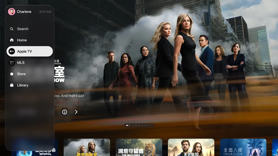 幕前焦點。在觀看 Apple Original 原創系列和電影時,你可以輕鬆獲取相關資訊,只要打開媒體播放器控制項目,即可進一步了解螢幕上的演員和播放中的音樂;隨著場景變換,資訊也會自動更新。而當你使用 iPhone 作為 Apple TV 的遙控器,「幕前焦點」的資訊就會在你掌上顯示5。