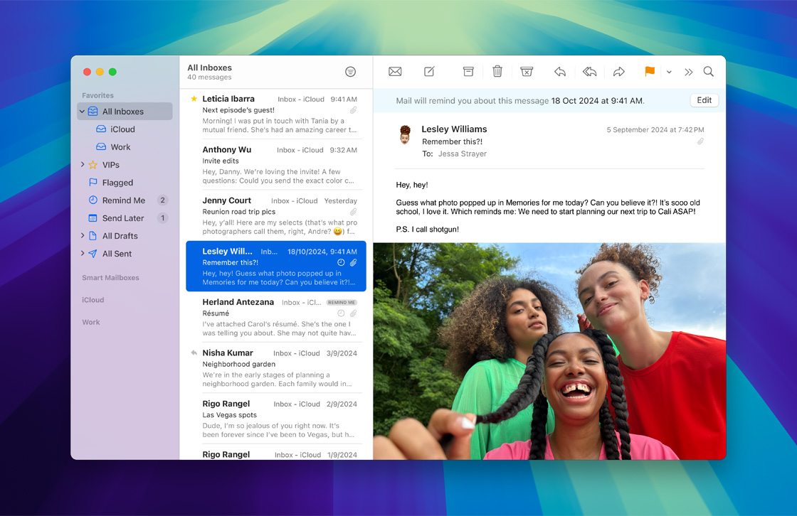 iCloud 郵件與你的 iPhone、iPad 或 Mac 上的郵件 app 全面整合,而透過 iCloud.com,你更可在任何地方輕鬆收發電郵。內置垃圾內容保護及防網絡釣⿂等保安功能,幫你偵測並阻擋垃圾郵件傳送至你的收件箱。要設定你的 @icloud.com 電郵地址非常簡單,在訂購 iCloud+ 時,你可使用自訂網域來建立你的專屬電郵。