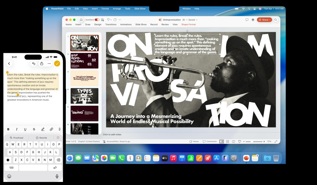 假設你在 iPhone 上開始寫一封電郵,但希望在你的 Mac 上完成;又或者你在 iMac 上開始寫一份報告,但又趕著出席會議,希望能在 iPad 上繼續;接手功能,讓這一切變得順理成章。當你的 Mac 與你的 iPhone 或 iPad 彼此靠近時,就懂得自動把你手上的事情,從一部裝置傳到另一部裝置4。你最後使用的 app 圖示,會出現在你接下來使用的裝置上,並顯示在 Mac 或 iPad 上的 Dock,或 iPhone 上的 App 切換器上。只需按下或輕點一下,即可從之前停下的位置繼續開始,而無需重新搜尋檔案。接手功能更可廣泛用於整個系統,並可與第三方 app 配合運作。