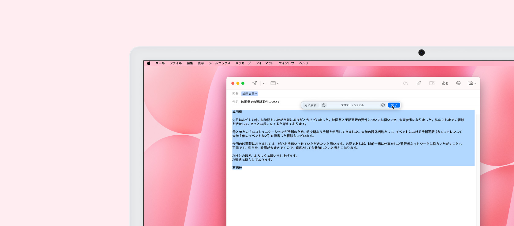 Apple Intelligenceは、あらゆる段階であなたのプライバシーを守れるように設計されています。オンデバイス処理をMacの基盤に組み込むことで、あなたの個人情報を収集することなく認識できるようにしました。