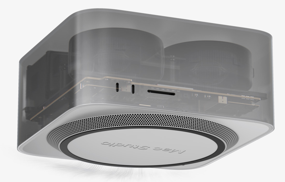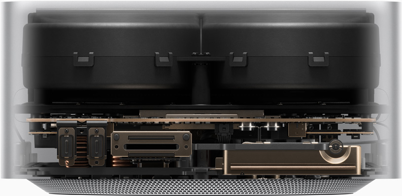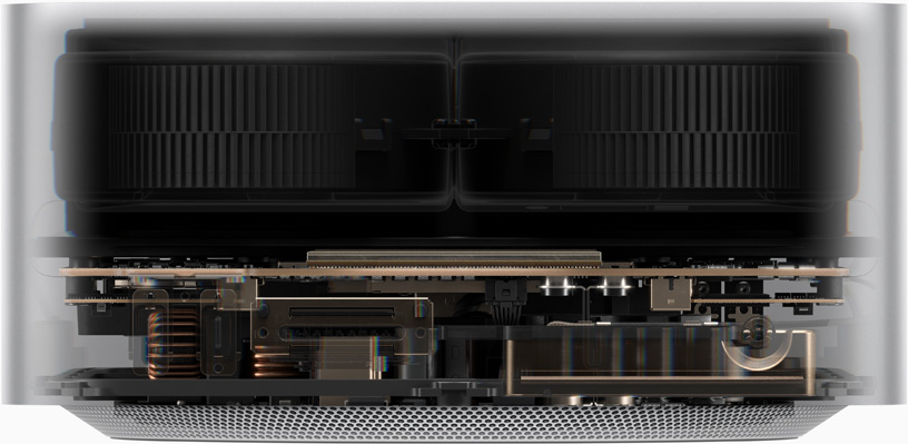 Kvadratiniame 19,7 cm „Mac Studio“ korpuse slypi pažangi termosistema. Ji sukurta taip, kad leistų „M4 Max“ ir „M3 Ultra“ žaibišku greičiu atlikti pačias intensyviausias užduotis. Net ir turėdamas tiek neįtikėtinos galios, „Mac Studio“ veikia tyliai, tad jis niekada tavęs neblaškys.