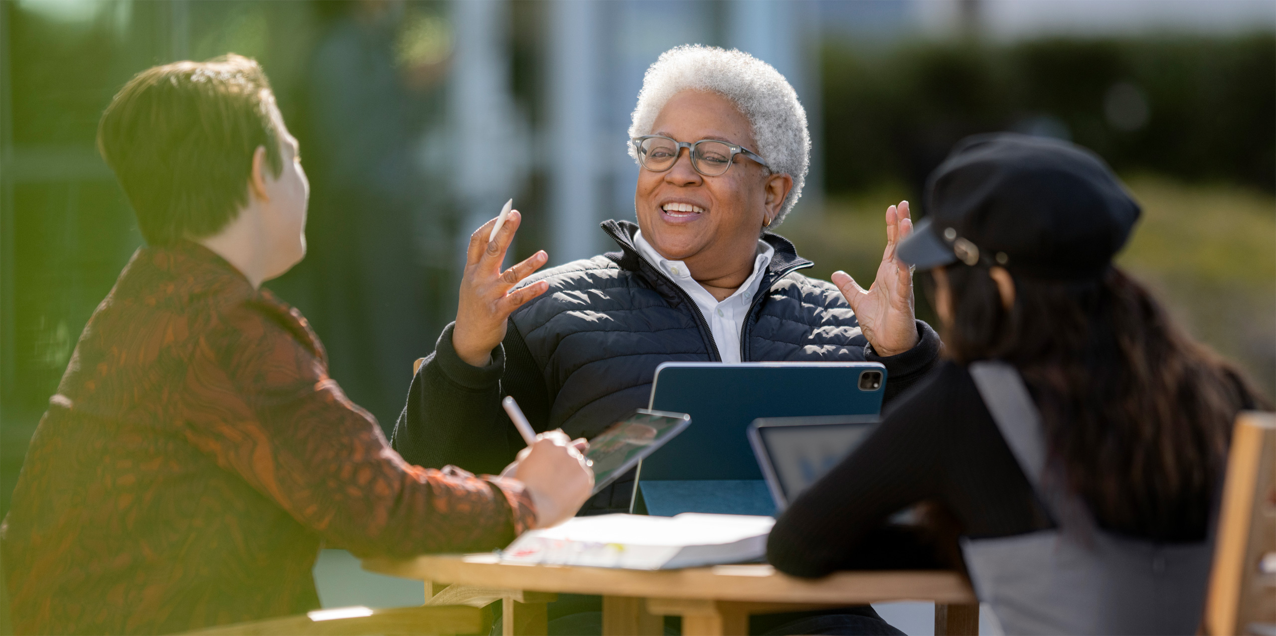 iPad Pro og Apple Pencil. Apple-teknologi gir superkrefter til Ajuans digitale lerret. iPads allsidighet gjør det til det perfekte verktøy for å illustrere, presentere og undervise. Apple Pencil er presis og føles som en vanlig blyant, som gjør det enkelt for Mance å vise hvordan elevene kan tegne og male med Adobe Fresco-appen.