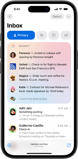 Priority messages in Mail elevate time-sensitive messages to the top of your inbox — like an invitation that has a deadline today or a check-in reminder for your flight this afternoon.