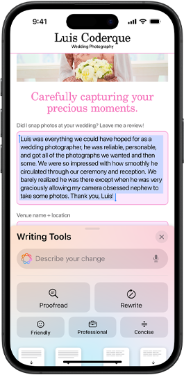 Transform how you communicate using intelligent Writing Tools that can proofread your text, rewrite different versions until the tone and wording are just right, and summarise selected text with a tap. Writing Tools are available nearly everywhere you write, including third-party apps.