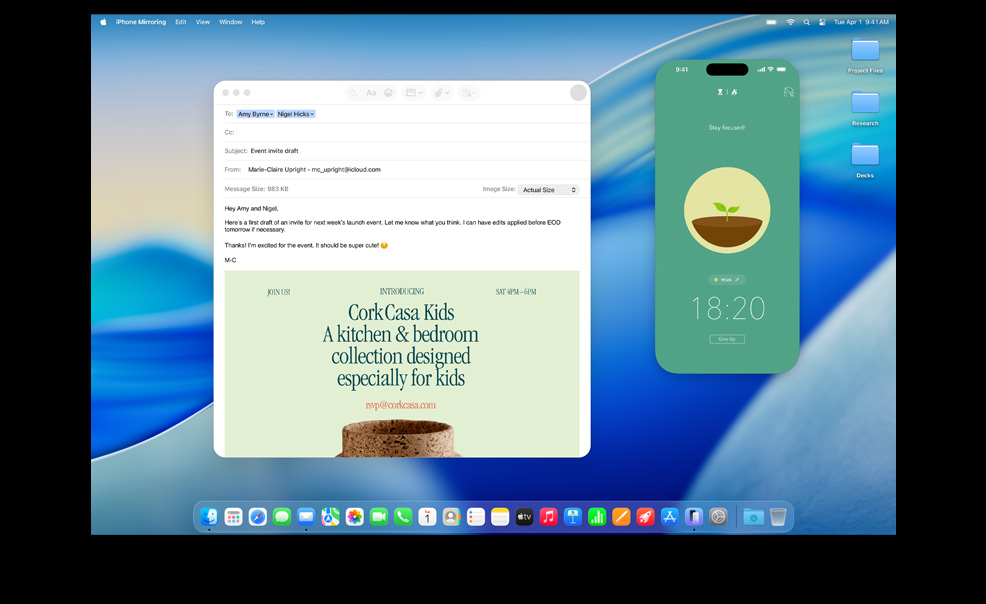 iPhone Mirroring lets you see and use your iPhone right from your Mac.5 So even if your phone is charging across the room, you can still access all your favorite iPhone apps. You can even drag and drop a video from your iPhone Photos app right onto your Mac desktop. Live Activities from your iPhone also appear on your Mac. So when timely events occur, you don’t have to reach for your phone to stay in the know.