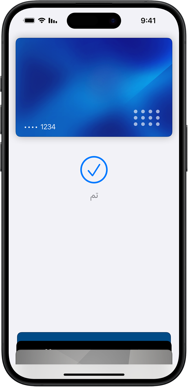• تعد Apple Pay أكثر أماناً من استخدام بطاقات الائتمان أو السحب أو بطاقات الدفع المسبق الفعلية. وهي تتطلب استخدام بصمة الوجه أو بصمة الإصبع أو رمز المرور الخاص بك لإتمام عمليات الشراء على iPhone أو Apple Watch أو Mac أو iPad. ولا تتم مشاركة رقم بطاقتك أو هويتك مع التجار، وكذلك لا تُحفظ أرقام بطاقتك الفعلية على جهازك أو على سيرفرات Apple.