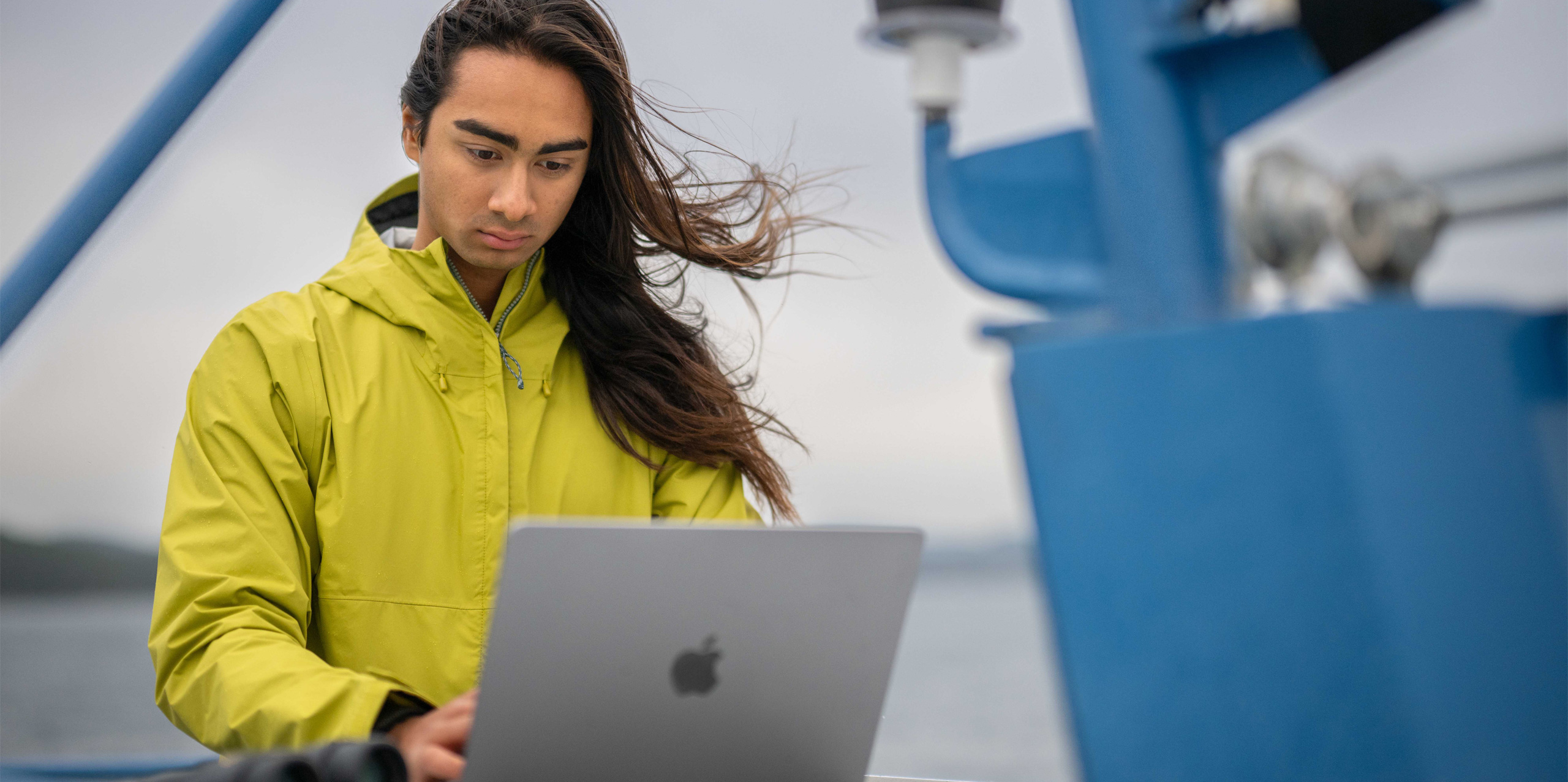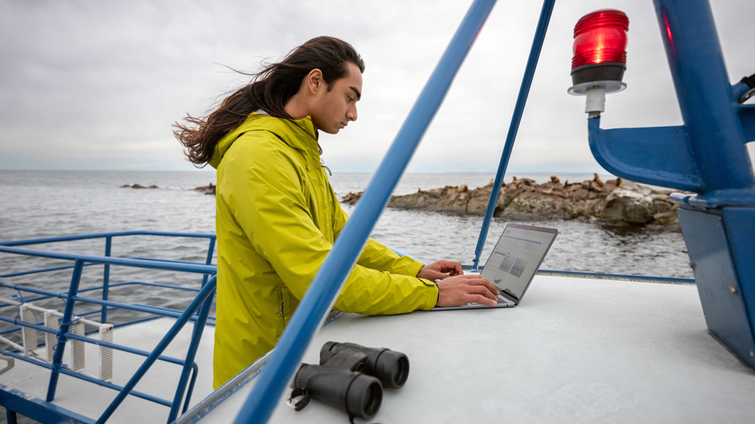 Apple technology also helps Bodhi conduct and synthesise his university research — like illustrating the impact of marine vessel activity on the endangered Southern Resident Killer Whale population in the Salish Sea. Taking his MacBook Air, iPhone and binoculars, he tackles the project’s fieldwork out on the water. He charts whale sightings by using Numbers and Keynote to create flowcharts and density maps that show where the locations intersect with popular ferry routes — helping to identify potential disturbances on resident whale populations. And on iPhone, he takes compelling photos and videos that document his findings.