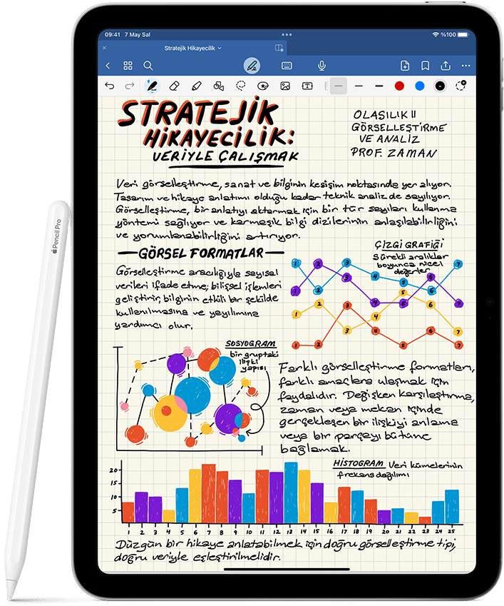Apple Pencil çizim yapmanın, not almanın ve belgeleri işaretlemenin nasıl bir deneyim olması gerektiğiyle ilgili standartları belirliyor. Sezgisel, hassas ve sihirli. Ayrıca mükemmel piksel hassasiyeti, düşük gecikme süresi, eğime duyarlılık ve temas seçici teknoloji desteği gibi özelliklere sahip. Apple Pencil’ı kullanmak ve ilham geldiğinde onunla fikirlerinizi hayata geçirmek inanılmaz kolay.