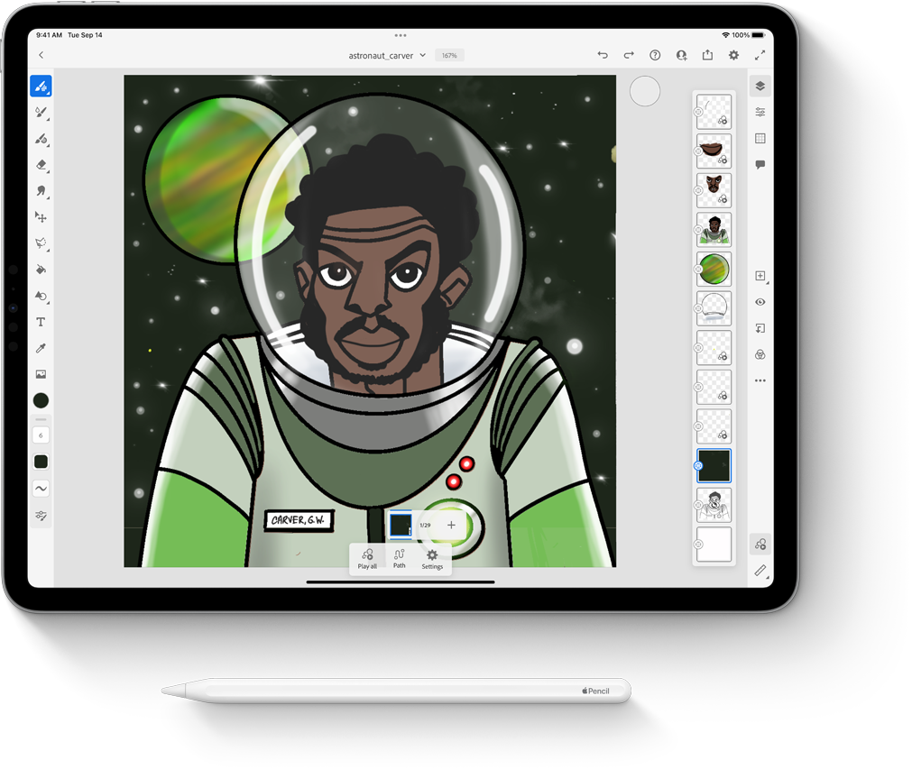 iPad Pro ve Apple Pencil. Apple teknolojisi Mance’in dijital sanat tuvaline güç veriyor. Çok yönlü oluşu iPad’i mükemmel bir illüstrasyon, sunum ve öğretim aracı yapıyor. Apple Pencil’ın hassasiyeti ve verdiği doğal his ise Mance’in Adobe Fresco uygulamasıyla çizim yapmayı ve ilham verici karakterlere renk vermeyi kolayca öğretebilmesini sağlıyor.
